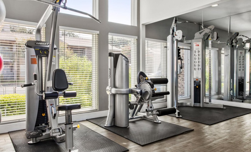 a kitchen with a dining table a gym with exercise equipment a room with a table chairs and a painting on the wall pet grooming area with steel washing bin and hose large community swimming pool at dusk